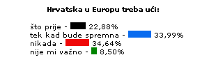 15.1.2004. - Oko petine Metkovaca u Europu želi što prije, trećina bi pričekala povoljnije uvjete, a čak trećina u Europi za Hrvatsku ne vidi ničega dobroga. Zanimljivo je da je tek 8% anketiranih izjavilo da o tome pitanju nema nikakav stav. Zahvaljujemo Vam na sudjelovanju i pozivamo na glasovanje u novoj anketi!