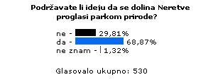 23.5.2004. - Našoj anketi odazvalo se čak 530 posjetitelja. Malo manje od trećine ne podržava park prirode u neretvanskoj dolini, preko dvije trećine podržava, a vrlo mali broj ih je nezainteresirano. Pogledajte novu anketu!