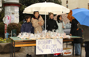 20.12.2004. - Unatoč subotnjoj kiši i hladnu vremenu članovi metkovske Frame strpljivo su čekali da prodaju oko 120 paketića s domaćim kolačima. Ta tradicionalna akcija djevojaka i mladića iz Frame ove se godine odvijala pod geslom "Dobrom djelom do raja", a prihod je namijenjen Caritasu Župe sv. Ilije koji je nedavno proveo akciju skupljanja pomoći za naše sugrađane kojima je ona potrebna. Aktivisti Caritasa svakoga ponedjeljka od 15 do 17 sati dežuraju u "Mijića kući" u Ulici Oca Ante Gabrića 27 u Metkoviću. Vaša pomoć može biti u novcu, hrani, raznim kućnim i higijenskim potrepštinama, pomoć u obliku razgovora sa starijima, čišćenje stana nemoćnima, kupovina teško pokretnima…