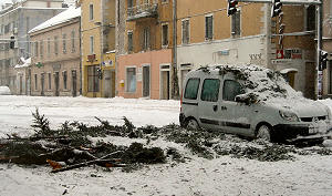 27.1.2005. - Snijeg koji je noćas nastavio padati prouzročio je prve probleme jer je visina sniježnog pokrivača dosegla oko 40 cm. U Metkoviću ima dosta vazdazelenih stabala čije grane zadržavaju snijeg pa nerijetko dolazi do pucanja. Vlasnik ovog automobila prošao je sa manjim oštećenjem jer je puknuta grana zakačila automobil samo vrhom. Sva sreća je da u tom trenutku nitko nije prolazio inače prometnom stazom uz gradski park. Stoga ne hodajte ispod stabala, naročito cedrova koji su skloni pucanju pod teretom snijega. Što se tiče gradskih prometnica, čiste se one koje su županijskog ili državnog ranga pa nema većih problema.