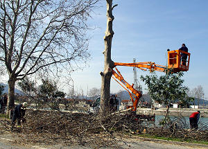 Metkovia, 26.3.2006. - Djelatnici Upravnog odjela za gospodarstvo grada Metkoviaa, uz pomoa pripadnika JVP Metkovia, HEP-a i Komunalnog poduzeaa ovih dana rade na obrezivanju platana na poeetku Splitske ulice. Razlog su prevelike krošnje eije grane mogu ugroziti promet i šetaee uz Neretvu. S kraja iste ulice, tj. ulaza u grad, nastavljaju se pripreme za postavljanje novih rasvjetnih stupova pa ae ta najprometnija ulica u potpunosti biti osvijetljena.