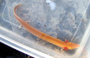 Metković, 27.10.2006. - Damir Milanović iz Glavica kraj Sinja jučer je u Prudu pronašao čovječju ribicu za koju se i prije znalo da živi na izvoru Norina, ali je, kako nam je rekao Jure Taslak, to prvi slučaj da je uhvaćena i snimljena.