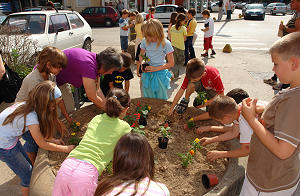 Metković, 22.5.2007. - Jutros smo učenike 1. A razreda OŠ Stjepana Radića zatekli kako s učiteljicom Anom Barbir sade cvijeće u arle na križanju ulica Matice hrvatske i Ante Starčevića.