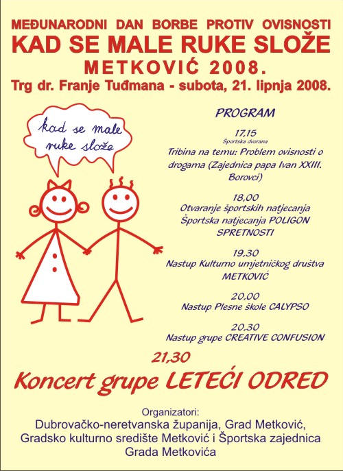 20.6.2008. - Središnja županijska manifestacija obilježavanja Međunarodnoga dana borbe protiv ovisnosti ove godine održat će se u Metkoviću 21. lipnja. Program započinje u 17.15 u Gradskoj športskoj dvorani i nastavlja se pred njom na Trgu dr. Franje Tuđmana.