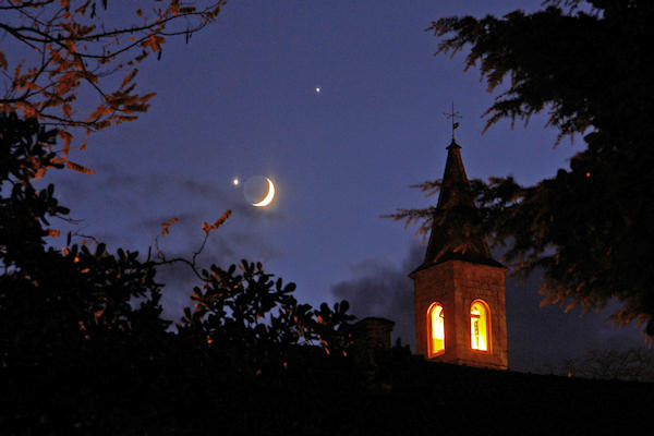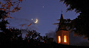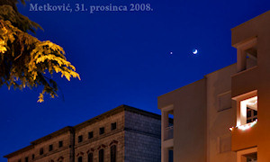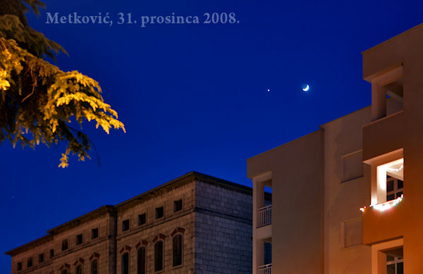 Metković, 1.12.2008. - Ušli smo u prosinac, mjesec u kojem je sve nekako drukčije. Osjeća se Božić pa je i večerašnji nebeski znak nekako u tome duhu. Iako zvijezda nije baš repatica, kroz granje stabala gradskoga parka uhvatili smo predvečer susret osvijetljenoga zvonika crkve Sv. Ilije s mjesecom i zvijezdama.