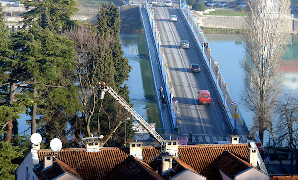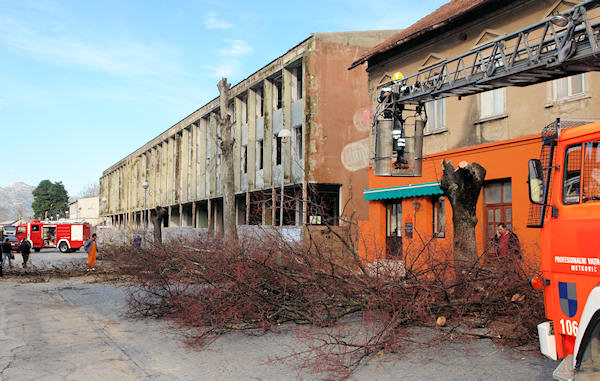 16.1.2009. - Radovi na sanaciji gradskog parka traju i dalje. U prvoj fazi najviše posla imaju gradski vatrogasci koji za to predviđena stabla krešu na određenu visinu. To uspijevaju uz pomoć velikih vatrogasnih ljestava u čijoj košari nije jednostavno ni stajati, a kamo li baratati motornom pilom.