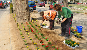 16.4.2009. - Lijepo vrijeme omogućilo je djelatnicima Komunalnoga poduzeća da nastave sa sadnjom cvijeća na zelenim površinama. Ovaj put zasađuje se pojas između ulice Stjepana Radića i parkirališta uz park.