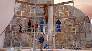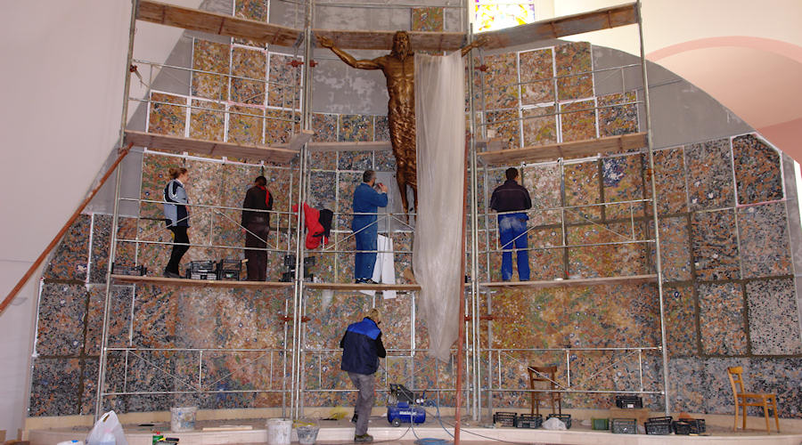 Metković, 29.11.2009. - Šest dana do posvete nove crkve Sv. Nikole Biskupa radnici se nadmeću s rokovima. Danas smo snimili postavljanje mozaika koji predstavlja svemir u središtu kojega je trometarski brončani kip uskrsla Isusa.