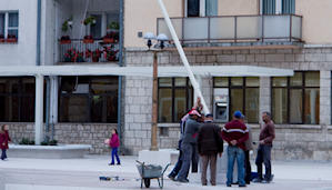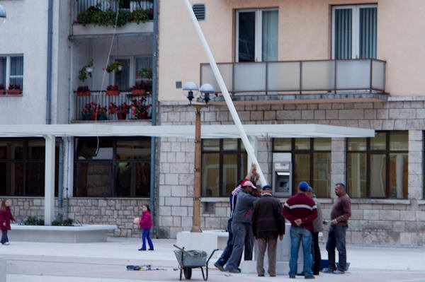 Metković, 4.12.2009. - Podizanje jarbola na štandarac na Trgu kralja Tomislava posjetilo nas je da su radovi došli blizu kraja. Preostalo je još samo unutrašnje uređenje fontane i postavljanje prozirne stjenke u okvir nad njom.