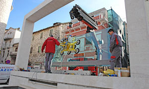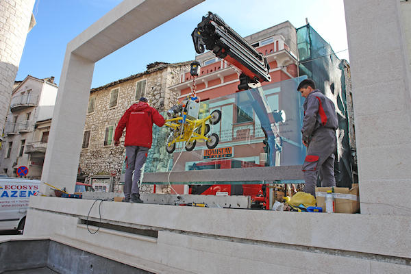 Metković, 9.12.2009. - Danas se na Trgu kralja Tomislava okupilo dosta znatiželjnika koji su pratili postavljanje velike staklene stijene.