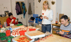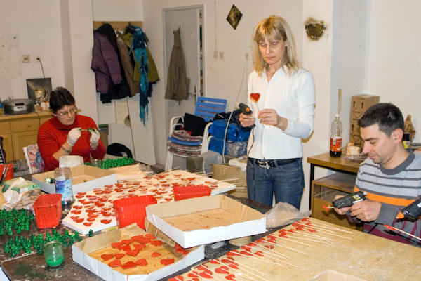 5.2.2010. - Dio članova i volontera Udruge osoba s invaliditetom Prijatelj zatekli smo danas u radionici Udruge kako izrađuju crvena srca od gline koja će se za Valentinovo dijeliti građanima.