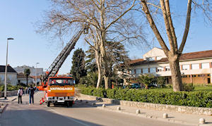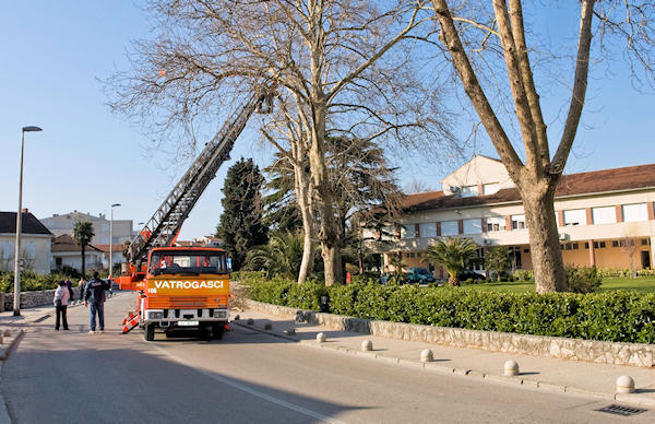 21.3.2010. - Jučer su vatrogasci JVP Metković obavili rezidbu platana ispred Osnovne škole Stjepana Radića koja je od njih naručila taj posao jer je stabla trebalo svesti na sigurnu mjeru.