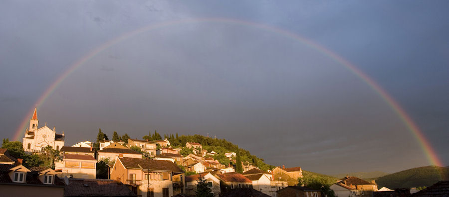 31.5.2010. - Prema svim prognozama još ćemo pričekati do pravoga ljeta. Današnji popodnevni pljusak, osim što je donio buru i pad temperature, na odlasku nam je donio i dugu nad gradom. Sigurno je bilo i onih koji su se u tom trenutku našli na boljim pozicijama, no i ova naša fotografija može stat.