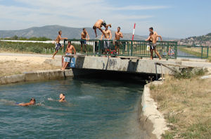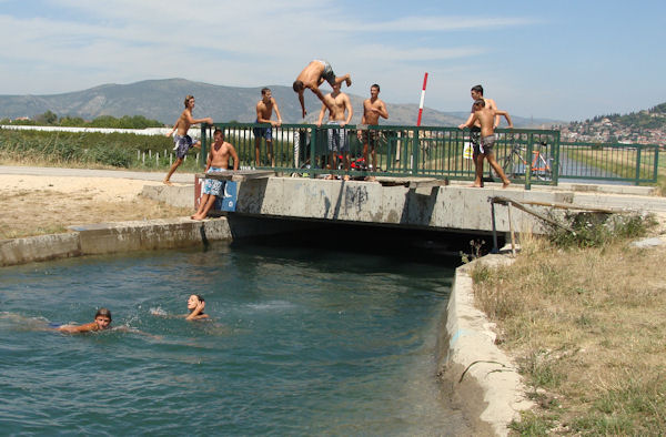 Metković, 3.8.2010. - Kao i proteklih godina za vrijeme velikih vrućina omiljeno okupljalište mladih stanovnika Klade i dalje je natapni kanal što vodu iz Neretve tunelom kroz Predolac vodi u donjoneretvanska polja. Mjesto okupljanja je most na cesti koja preko Klade vodi prema Dubravici, a najveća gužva je između 13 i 16 sati.