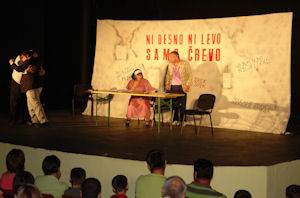 Metković, 10.8.2010. - Na sceni Ljetnog kazališta sinoć je izvedena kazališna predstava HNK Varaždin Skupština, autora i redatelja Ljubomira Kerekeša. Riječ je o satiričnoj komediji koja na ironičan način prikazuje izbornu skupštinu seoskog odbora u Črevu koji zasjeda jednom godišnje kako bi donio važne odluke za zajednicu.