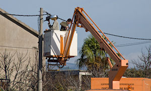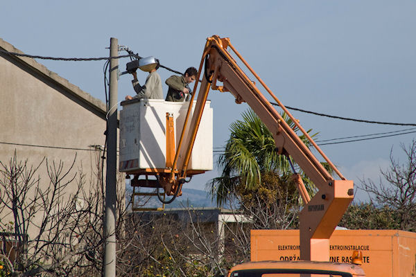 Metković, 12.11.2010. - Danas smo u Ulici Petra Krešimira IV., najdužoj metkovskoj ulici zatekli radnike tvrtke Unelpo kao stare natrijeve ulične svjetiljke zamjenjuju novima.