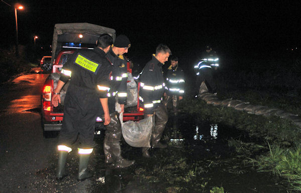 Metković, 26.11.2010. - Svi su odahnuli kada je Neretva počela opadati, ali situacija još nije najbolja pa djelatnici JVP Metković za svaki slučaj pripremaju vreće s pijeskom.