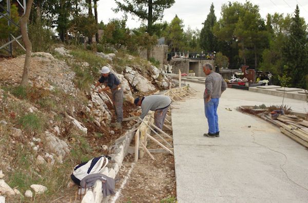 28.10.2011. - Lijepo vrijeme djelatnici Komunalnog poduzeća Metković iskoristili su za uređenje okoliša na Gradskom groblju Sv. Ivana. U sklopu radova gradi se i zid u novom dijelu groblja. Radove izvode djelatnici metkovske građevinske tvrtke Dobranje-ing. Gradnja zida dio je projekta kojega je Komunalno poduzeće Metković izgradilo u okviru tridesetogodišnjeg plana izgradnje groblja kojim je obuhvaćena izgradnja novih ukopnih mjesta, prilaznih putova i pratećih objekata te uređenje okoliša.