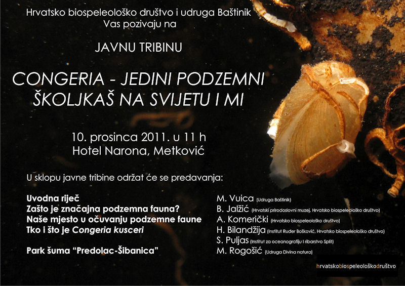 11.12.2011. - Iznimno dobro posjećenu tribinu u metkovskom Hotelu Narona organiziralo je Hrvatsko biospeleološko društvo u suradnji s domaćom Udrugom Baštinik. Tema je bila Congeria – jedini podzemni školjkaš na svijetu i mi.