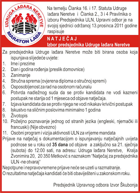 30.12.2011. - Udruga lađara Neretve održala je Izvještajnu skupštinu na kojoj je podneseno izviješće o radu Udruge u 2011. te predočeno financijsko izviješće. Iako se Skupština trebala održati početkom sljedeće godine održana je jučer jer sadašnjoj Upravi istječe mandat, a htjelo se i 2011. završiti s položenim računima.