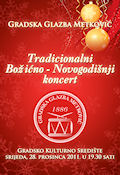 27.12.2011. - Gradska glazba Metković poziva Vas da u srijedu 28. prosinca dođete u Gradsko kulturno središte Metković na njihov tradicionalni Božićno-novogodišnji koncert. Taj koncert, koji započinje u 19,30, ujedno je i posljednji događaj u programu ovogodišnjih Prosinačkih svečanosti što ih svake godine pod pokroviteljstvom Grada Metkovića organizira Gradsko kulturno središte.