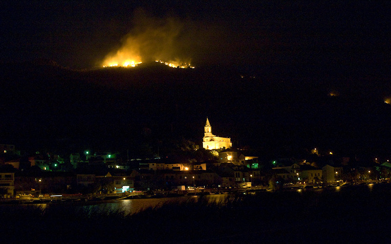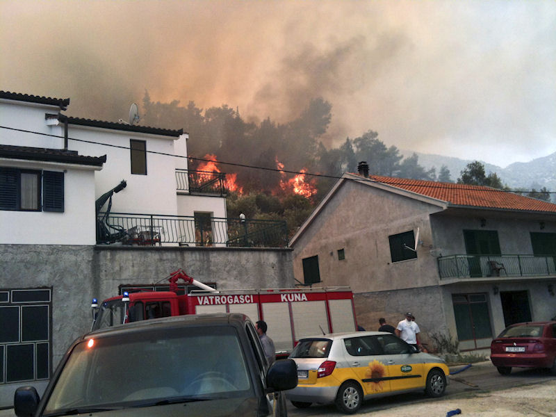 11.8.2012. - Pobjedu kominskih lađara na Maratonu zasjenila je vatrena prijetnja s brda nad selom. Požar koji se danas razbuktao nad Kominom nije ugašen pa vatra i dalje gori na nepristupačnome terenu, a fronta se već razvukla na nekoliko kilometara. Ostaje samo nada da vjetar do jutra neće promijeniti smjer i ugroziti kuće.