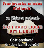 11.10.2012. - U organizaciji Franjevačke mladeži u petak, 12. listopada 2012. u crkvi svetog Ilije u 20 sati održat će se predavanje za mlade pod nazivom „Što i kako ljubiti i biti ljubljen“. Gost-predavač je dr. don Ivan Bodrožić.
