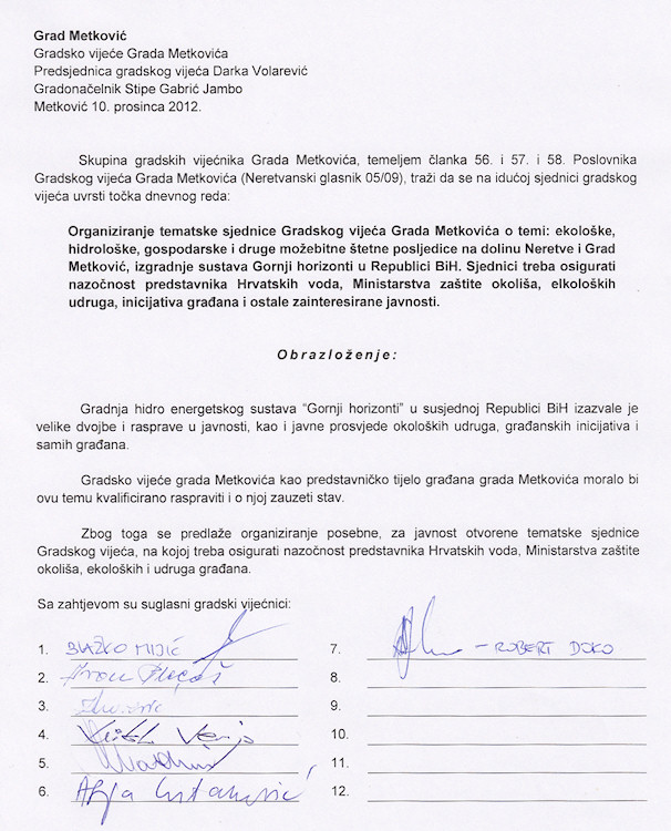 11.12.2012. - Skupina gradskih vijećnika Grada Metkovića pismenim je podneskom zatražila od gradonačelnika Grada Metkovića Stipe Gabrića Jambe i predsjednice Gradskog vijeća Grada Metkovića Darke Volarević da se na dnevni red iduće sjednice Gradskog vijeća uvrsti organiziranje tematske sjednice Gradskog vijeća Grada Metkovića, otvorene za javnost, na temu mogućih ekoloških i gospodarskih šteta, koje se mogu pojaviti kao posljedica izgradnje sustava Gornji horizonti u susjednoj Republici BiH.