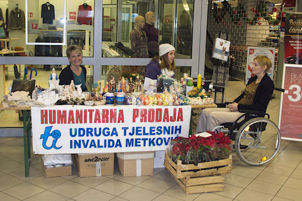 21.12.2012. - Članovi Udruge osoba s invaliditetom Prijatelj iz Metkovića ovih dana na više mjesta prodaju prigodne predmete koje su sami izradili kako bi skupili još novca za kupnju kombija. U Metkoviću naći ćete ih u Mercatoru i Konzumu, u Opuzenu u Solin građi, u Čapljini u Mercatoru, a u Splitu u Emmezeti.