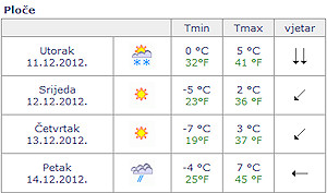 11.12.2012. - Prema prognozi Državnoga hidrometeorološkog zavoda i intrenetske stranice yr.no očekuju nas dvije vrlo hladne noći. DHMZ nema prognozu za Metković pa donosimo onu za Ploče u kojima će sigurno biti koji stupanj toplije nego u Metkoviću. Naročito hladno bit će sa srijede na četvrtak pa dobro zamotajte pipe u dvorištu.