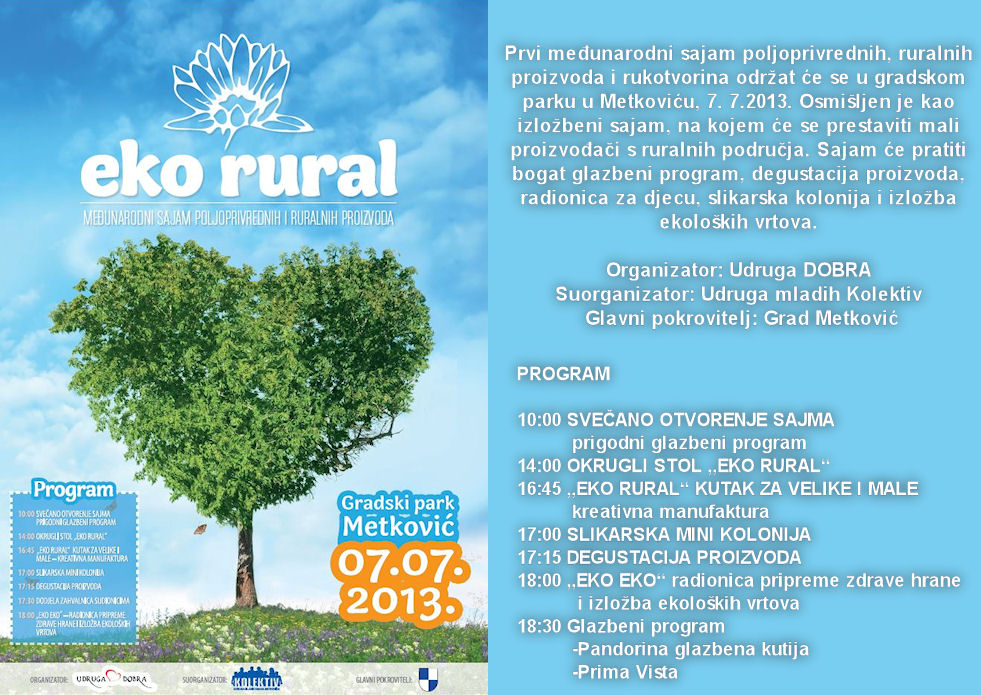 7.7.2013. - Evo obavijesti onima koji su, unatoč svemu, još uvijek ostali neobaviješteni. Danas će u 10 sati u Gradskome parku biti otvoren Prvi međunarodni sajam poljoprivrednih i ruralinih proizvoda i rukotvorina Ekorural na kojemu će se predstaviti mali proizvođači s ruralnih područja.