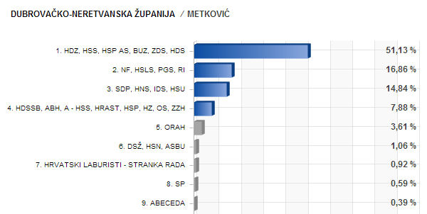 26.5.2014. - Nakon što su obrađena sva biračka mjesta u Metkoviću, na kojima je bilo upisano 13.787 glasača, poznati su konačni rezultati izbora za Europarlament. Glasovalo je 3.683 (26,71 %) građana, a broj važećih listića je 3.577 (97,12 %). Koalicijska lista HDZ-a s 1.829 (51,13 %) glasova apsolutni je pobjednik.