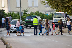 8.9.2014. - Danas je prvi nastavi dan u novoj školskoj godini pa su metkovske ulice jutros oživjele. Prvašiće nije bilo teško uočiti jer su do škole išli u pratnji starijih, a novost je da je na frekventnom pješačkom prijelazu pokraj OŠ Stjepana Radića o sigurnu prijelazu učenika preko ulice brinuo prometni redar.