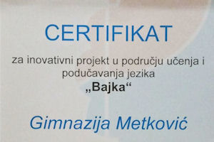 27.9.2014. - Na svečanoj dodjeli nagrada/priznanja Europska oznaka jezika, održanoj na Dan Europskih jezika 26. rujna u zgradi Ministarstva znanosti, obrazovanja i sporta, među tri najbolja projekta, od trideset prijavljenih, nagrađen je i projekt Gimnazije Metković Bajka.
