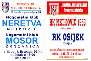 1.10.2014. - Danas u 16 sati na teren Igrališta iza Vage istrčat će nogometaši (na tablici III. HNL jug) četveroplasirane Neretve i dugopalsiranoga Mosora iz Žrnovnice. Vjerujemo se da ćete biti među onima koji će vidjeti kako će Predolac nadvisiti Mosor. U subotu vas pozivamo u Gradsku športsku dvoranu da podržite sjajan start domaćih rukometaša u I. hrvatskoj rukometnoj ligi. Vodeći RK Metković 1963 ugostit će RK Osijek koji je treći na tablici.