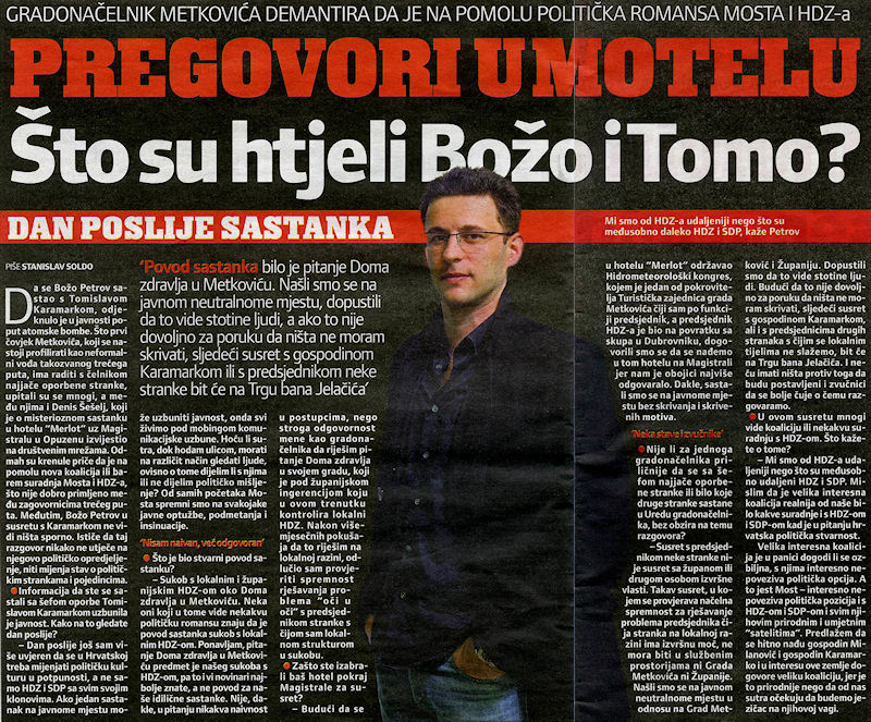8.3.2015. - Pod naslovom Pregovori u motelu; Što su htjeli Božo i Tomo, današnja Slobodna Dalmacija objavila je intervju s metkovskim gradonačelnikom Božom Petrovom koji u njemu negira bilo kakvu misterioznost svoga sastanka s Karamarkom.