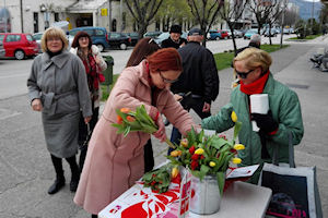 Metković, 4.4.2015. - Danas je u organizaciji Foruma žena SDP-a Metković održana akcija Omiljeni cvijet Ane Rukavine. Prodajom tulipana Metkovke su se tako pridružile humanitarnoj akciji koju već nekoliko godina organizira Forum žena SDP-a Hrvatske, a prikupljeni novac biti će uplaćen na račun Zaklade Ana Rukavina.