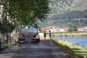 Metković, 29.4.2015. - Budući da od ponedjeljka na Šetalištu 116. brigade HV-a više nije dopušteno parkiranje, jutros su ga djelatnici Čistoće očistili, a potom djelatnici JVP Metković oprali. To će razveseliti mnoge građane koji šetalište koriste za šetnju i rekreaciju. Vozila koja su se nekada tamo parkirala raspoređena su na novo parkiralište uz Policijsku postaju i oko nje.