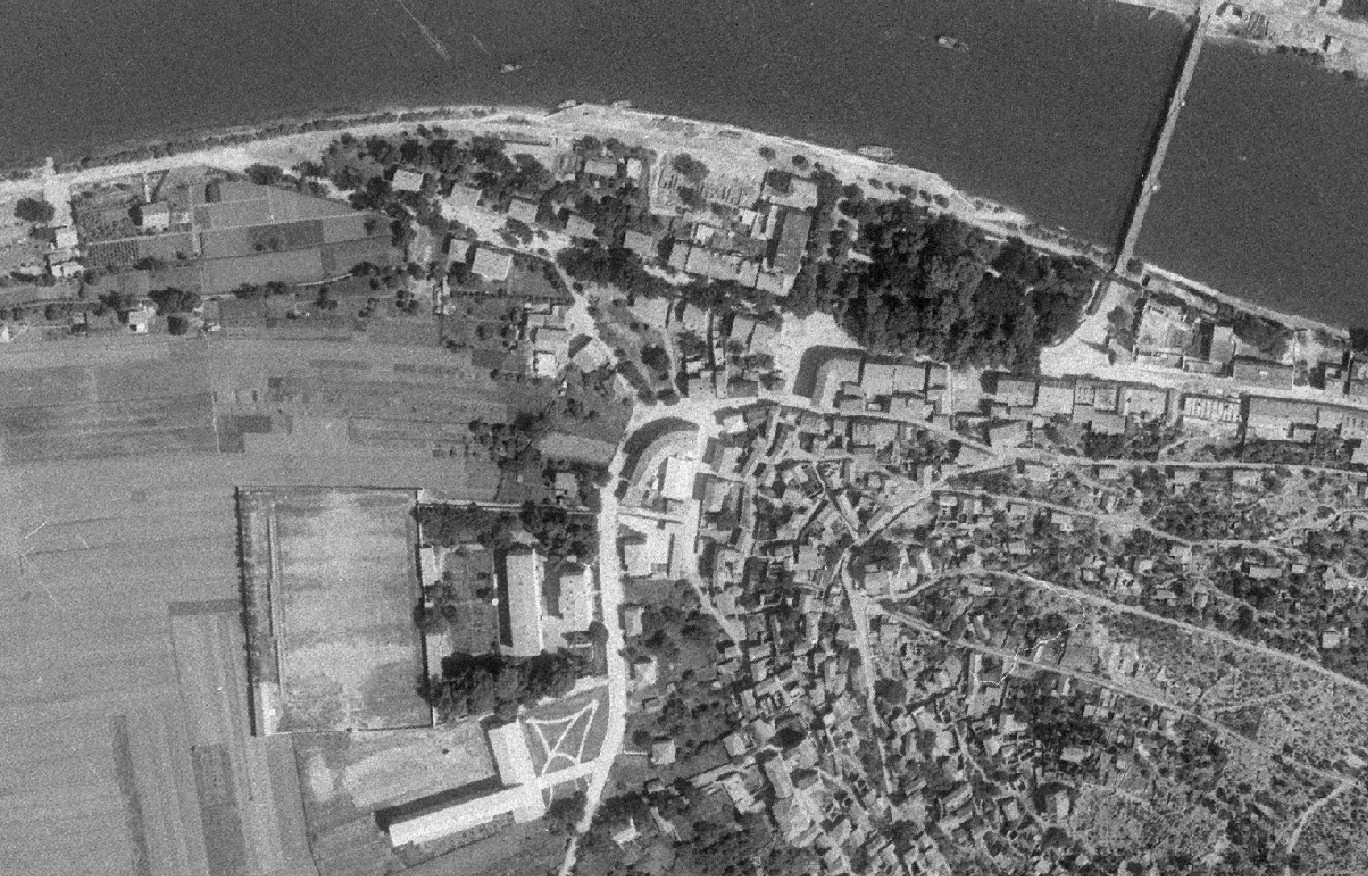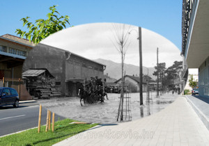 26.8.2015. - Jutros smo fotografirali Hebrangovu ulicu s otprilike istoga mjesta s kojega je nastala fotografija poplave oko 1940. godine. Stari platani već su bili posječeni i zasađena nova stabla, vjerojatno lipe koje su na novoj fotografiji zamijenili murvci.