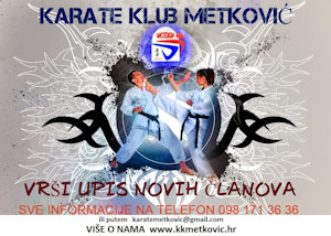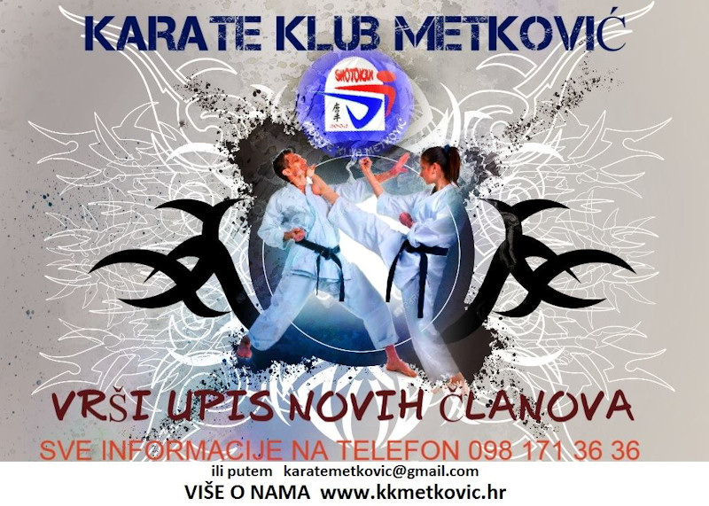31.8.2015. - Karate-klub Metković poziva sve koji žele trenirati karate da počinje s upisom novih članova. Upisati se možete putem telefona 098 171 36 36, na e-mail karatemetkovic@gmail.com ili osobno ponedjeljkom, srijedom i petkom od 18 do 20 sati u prostorijama Kluba pokraj TC Tommy u Metkoviću.