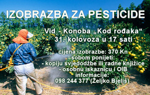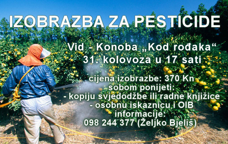 28.8.2015. - Izobrazba za pesticide održat će se u Vidu u Konobi „Kod rođaka“ 31. kolovoza s početkom u 17 sati. Sve informacije na 098 244 377 (Željko Bjeliš).