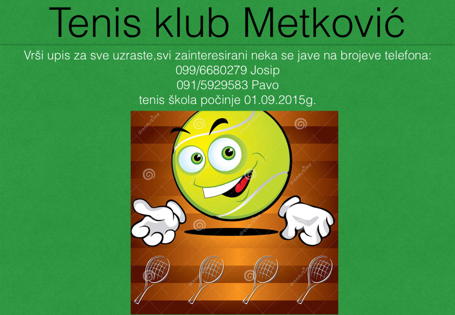 28.8.2015. - Teniski klub Metković upisuje članove svih uzrasta. Škola tenisa počinje 1. rujna pa se javite Josipu (099 668 20 79) ili Pavi (091 592 95 83).