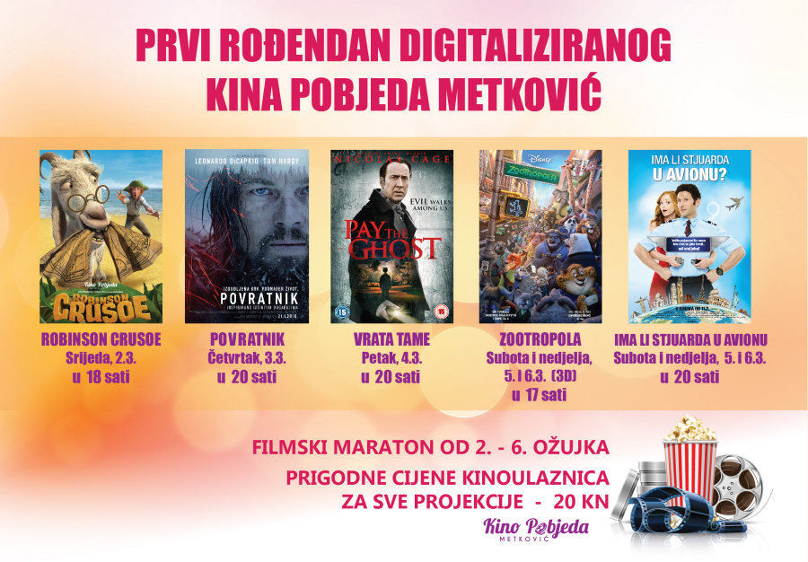 1.3.2016. - Od srijede do nedjelje u Kinu Pobjeda pripremaju poseban filmski program povodom prve obljetnice otvaranja digitaliziranoga Kina 'Pobjeda' koje je privremeno smješteno u kazališnoj dvorani metkovskoga GKS-a.