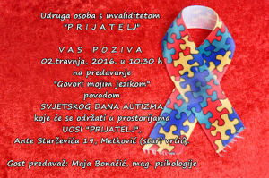 30.3.2016. - Udruga osoba s invaliditetom Prijatelj poziva vas na besplatno predavanje Govori mojim jezikom koje će se 2. travnja (subota) na Svjetski dan svjesnosti o autizmu održati u 10:30 u prostorijama UOSI Prijatelj, Ante Starčevića 19 (stari vrtić).