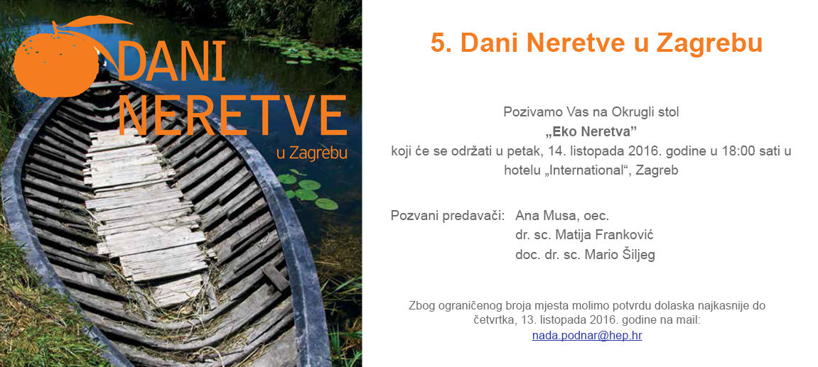 9.10.2016. - U sklopu V. Dana Neretve u Zagrebu će se u Hotelu Internacional 14. listopada (petak), s početkom u 18 sati održati Okrugli stol pod nazivom Eko Neretva, na kojemu će govoriti Ana Musa, Matija Franković i Mario Šiljeg. Zbog ograničena broja mjesta dolazak najavite na nada.podnar@hep.hr.