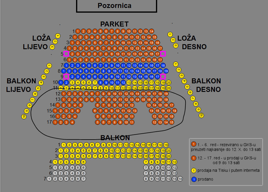 11.10.2016. - Zbog velike potražnje za ulaznicama na blagajni GKS-a za predstavu Maša i Medvjed, GKS je naknadno odlučio preuzeti prodaju i ulaznica od 12. do 17. reda (označeno na grafici). Te se ulaznice mogu kupiti do četvrtka u vremenu od 9 do 13 sati.