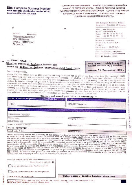 1.12.2016. - Iz Udruženja obrtnika Metković javili su nam da, premda se o tome već pisalo, obrtnici još uvijek internetom dobivaju ponude da ih se uvrsti u European Business Number (Europsku bazu podataka poslovnih subjekata). Naizgled ništa loše, no dobro proučite što potpisujete. Evo i naputka koji je svojedobno svojim članovima dala Obrtnička komora Međimurja.