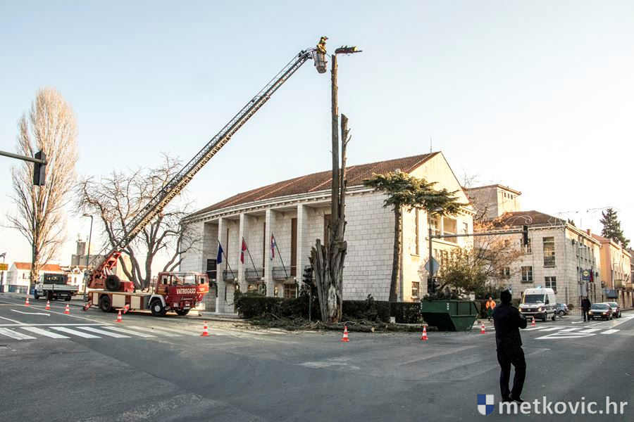 Metković, 10.1.2017. - Djelatnici JVP Metković i Čistoće Metković danas su uklonili stablo čempresa koje je pred današnjim GKS-om posađeno prije stoljeće i pol. Razlog je bio njegovo loše stanje, čime je predstavljao potencijalnu opasnost. Uza nj je uklonjen i ostatak cedra koji je olujno jugo prelomilo u veljači prošle godine.