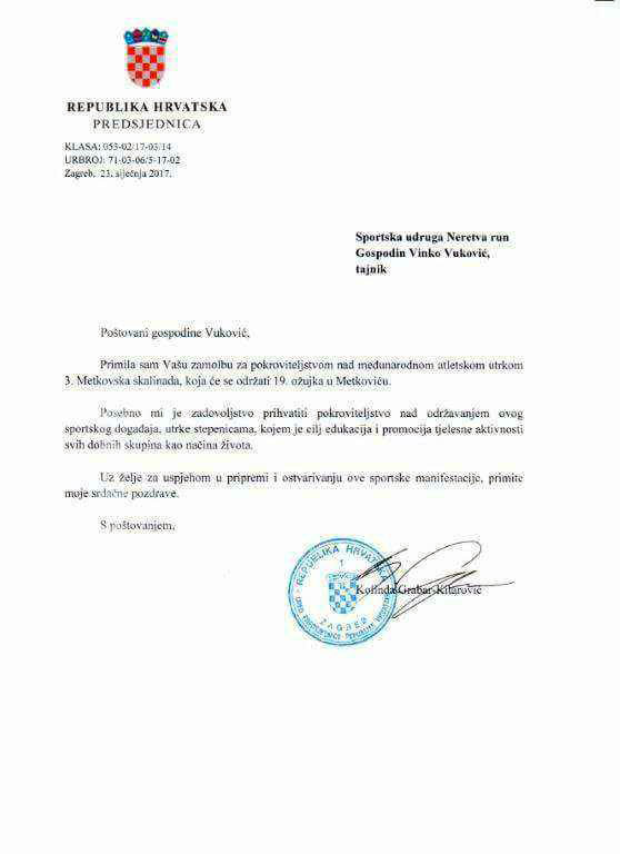 Metković, 25.1.2017. - SU Neretva run, organizator III. Metkovske skalinade, dobila je od predsjednice RH Kolinde Grabar Kitarović potvrdu o visokom pokroviteljstvu nad tom manifestacijom koja će se održati 19. ožujka ove godine.