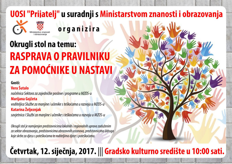 Metković, 10.1.2017. - UOSI Prijatelj u suradnji s Ministarstvom znanosti i obrazovanja organizira okrugli stol na temu Rasprava pravilniku za pomoćnike u nastavi, koji će se održati u Gradskom kulturnom središtu u četvrtak, 12. siječnja s početkom u 10 sati.